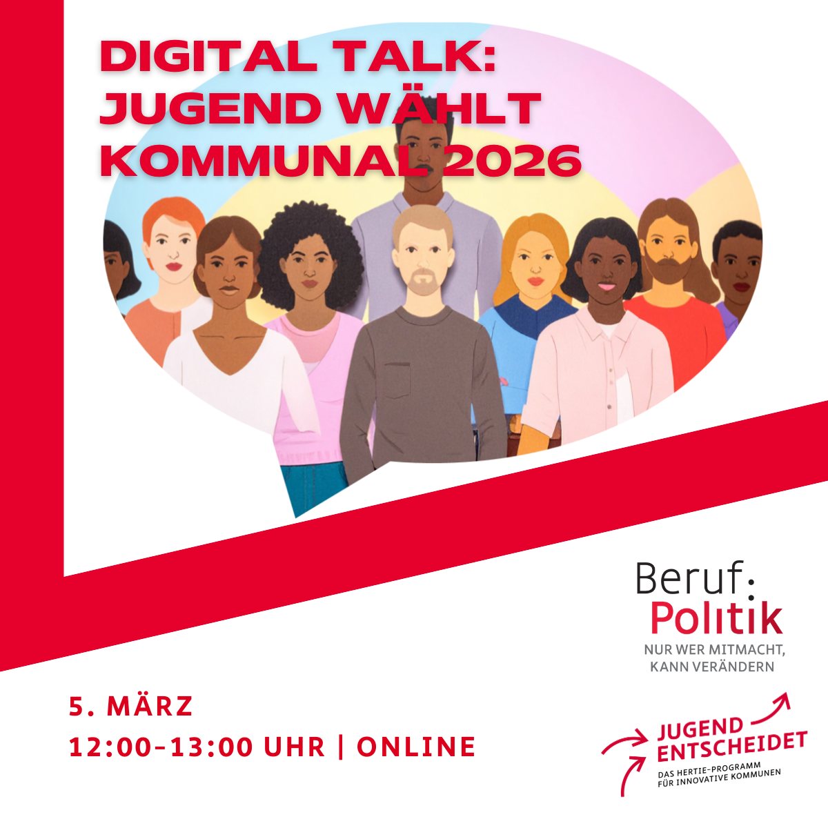 In unserem nächsten Digital Talk gemeinsam mit dem Hertie-Projekt Beruf:Politik am Donnerstag, den 05. März 2026 von 12:00-13:00 Uhr gehen wir der Frage nach, wie Kommunen aktiv dazu beitragen können, junge Menschen vor Kommunalwahlen abzuholen und was es braucht, damit junge Menschen auch selbst kommunalpolitisch aktiv werden. Zudem bekommen wir schon einen kleinen Einblick in die Ergebnisse der U18-Wahl in Bayern.