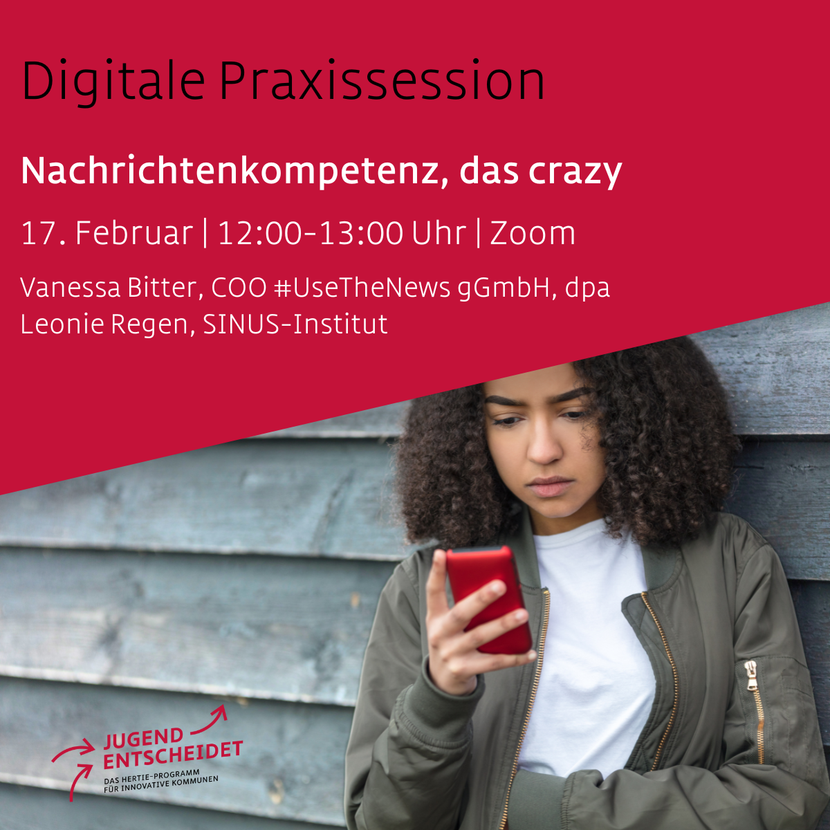 Für junge Menschen ist das Erwachsenwerden geprägt von politischen Umbrüchen und einer digitalen Welt. Daraus folgt eine neue Form der Informationsvermittlung. Wie junge Menschen dabei Nachrichten konsumieren und einordnen und wie das ihren Blick auf die Welt prägt, haben wir in unserer letzten Digitalen Praxissession Nachrichtenkompetenz, das crazy! diskutiert.